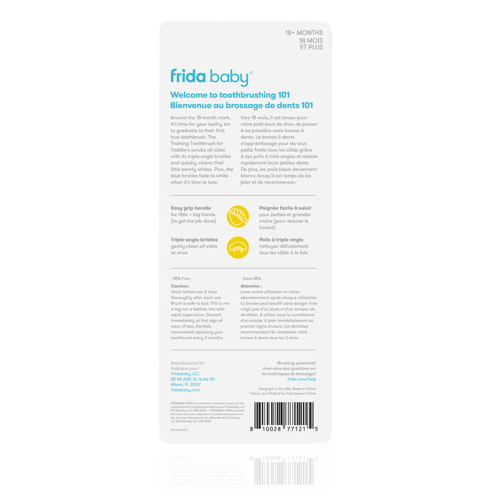 Your kiddo has graduated from the Training Toothbrush for Babies to a mouth full of baby teeth. It's time to level up their oral care game and start practicing good oral hygiene with the Training Toothbrush for Toddlers. Equipped with triple-angle bristles which clean all sides of their teeth at once, this toothbrush makes brushing their teeth take a shorter amount of time than a traditional toothbrush. The stay-put suction cup keeps the brush from rolling off countertops, while the easy-grip soft silicone handle is easy to maneuver for toddlers and parents - so you can make sure the job really gets done. Build healthy oral health habits with the entire oral care line from Frida Baby.