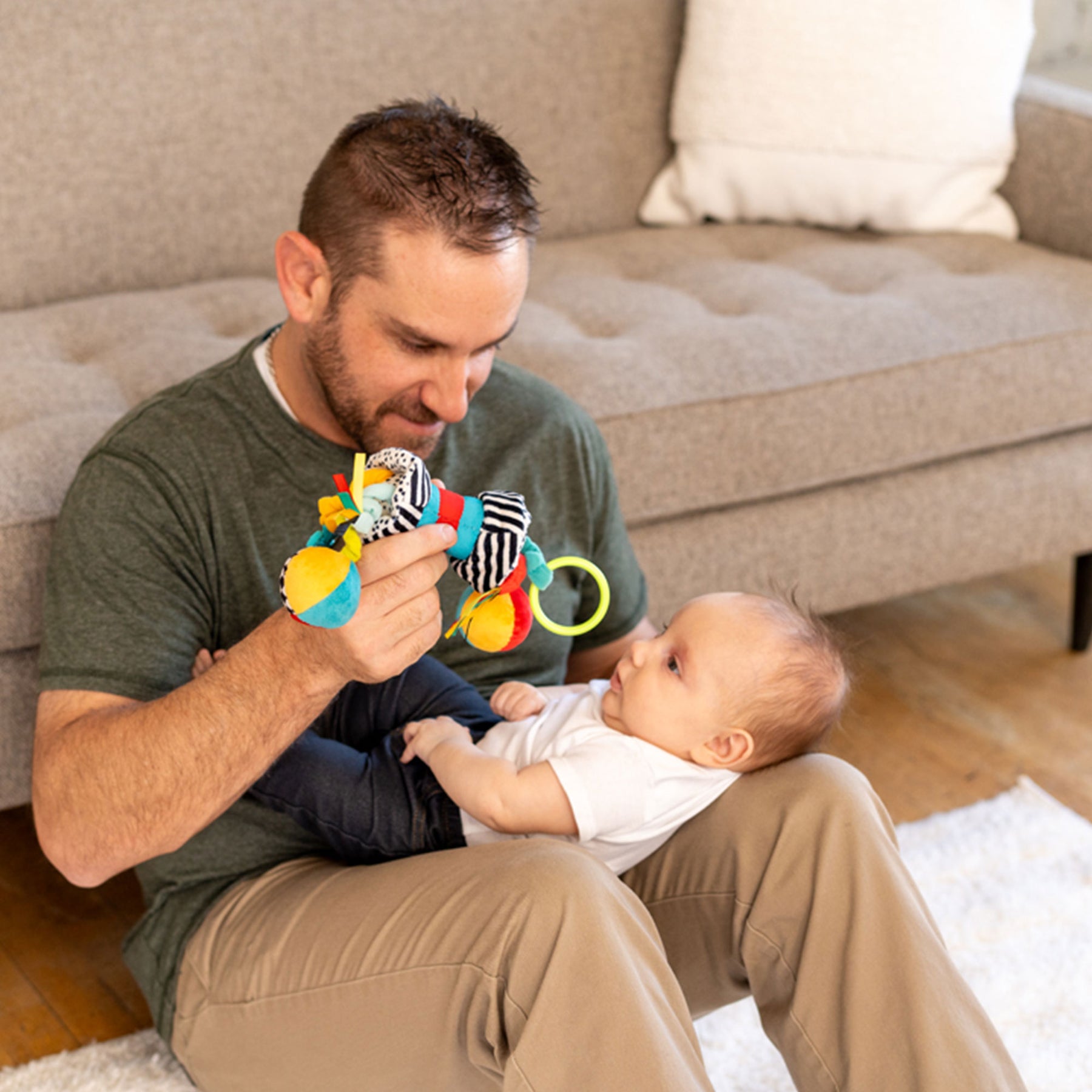 A take-along-toy bursting with playtime fun. Easy-to-grasp, soft fabric design features crinkle textures, a chime, rattle, teethers, and more! The Zaggles is a compact travel toy baby will love. We’ve packed oodles of sensory play fun into this little gem. One ball features a chime, the other a squeaker, plus there are crinkle fabrics and elastic cords to add to the auditory and textural experience. The silicone teether and plastic ring offer two different textures for baby to explore with their hands and mouths. Easily attach it to baby links for on-the-go play.